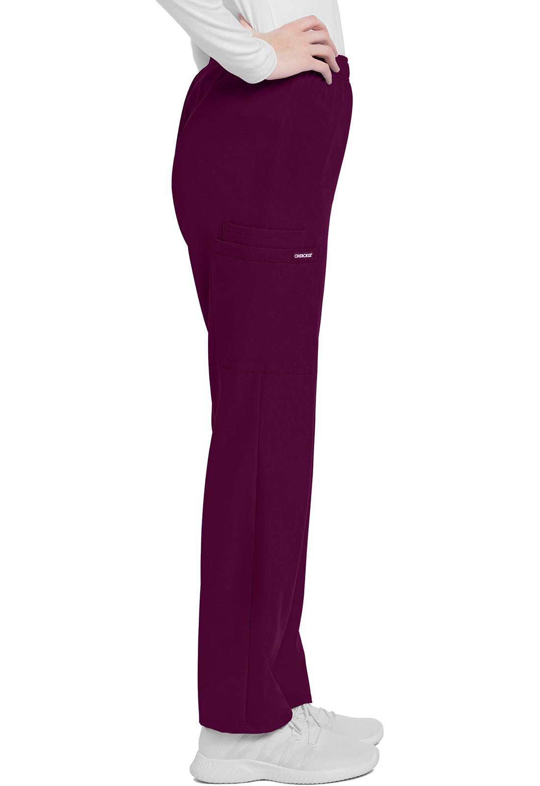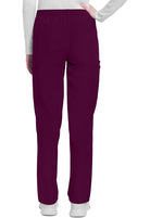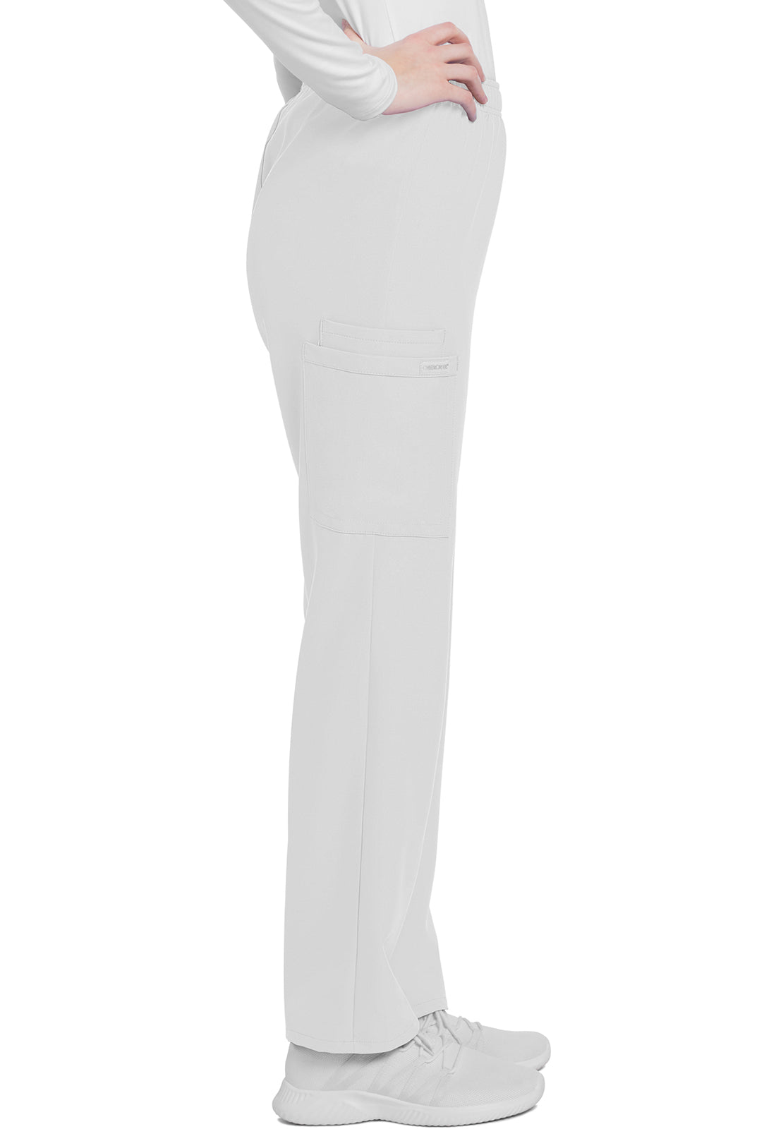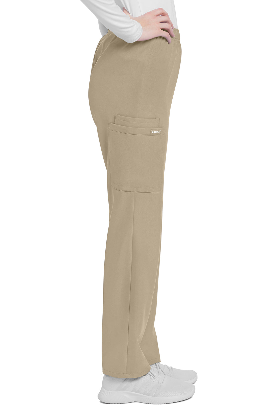 This mid rise pull-on pant has an elasticized waistband and an updated slimmer leg. There are three pockets for storage: two roomy cargo pockets and an additional accessory pocket inside the right cargo pocket. Cargo pockets include reverse hem trim. Decorative tonal topstitching for added detailing. Slim straight leg, 16" opening. Inseam: 31"