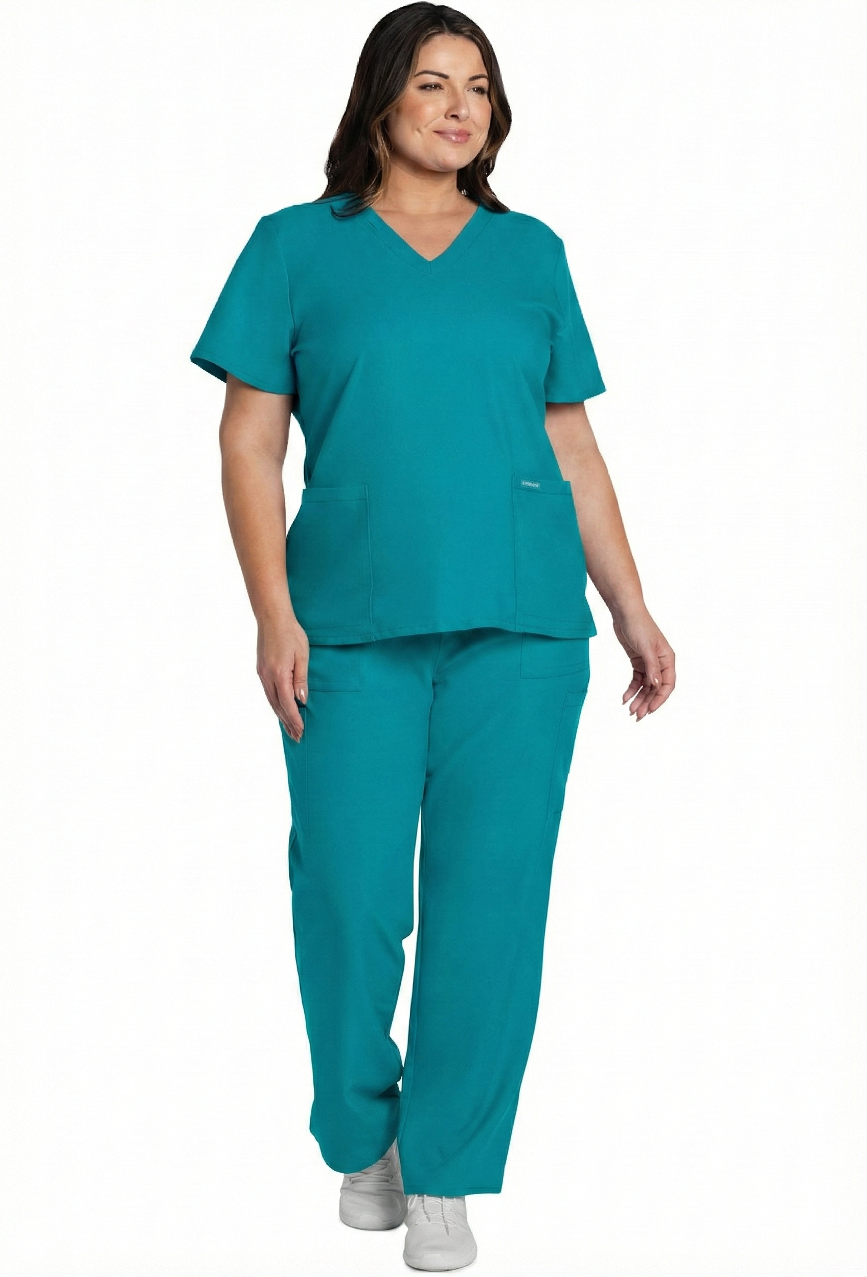 A v-neck top with built-in functionality elevates basic v-neck styling. There is a flat bungee on the neckband for an ID badge loop. There are two roomy patch pockets with a reverse hem trim. Side vents at hem for ease of movement. Decorative tonal topstitching adds the finishing touch to this scrub top. Modern Classic fit. Center back length: 26"