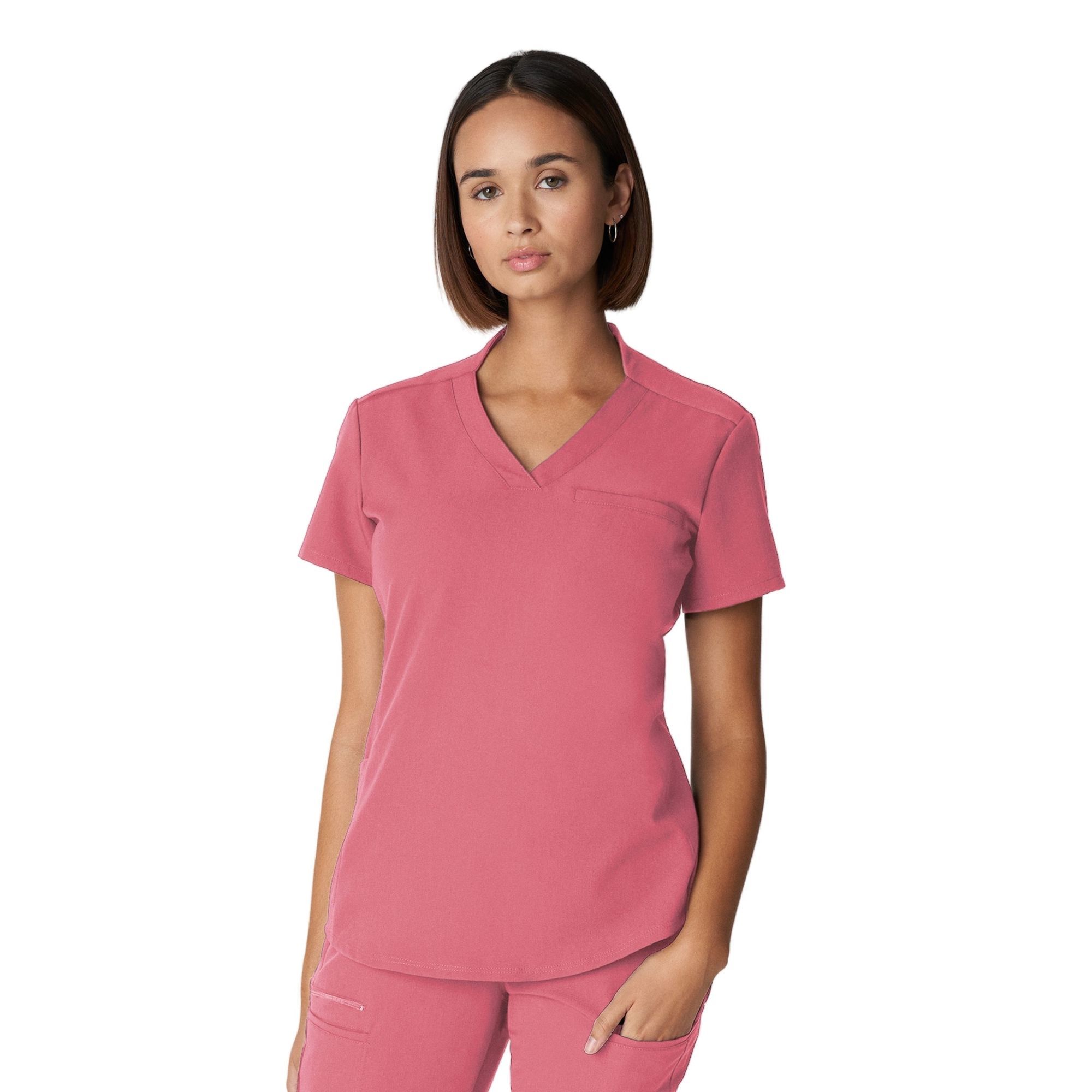 Introducing the Jersey Knit Contrast Top - a stylish, comfortable scrub top made from high-quality jersey knit fabric. Featuring a contrasting design, V-neck, short sleeves, side slits, and spacious pockets, this easy-to-maintain top is perfect for healthcare professionals. Available in various sizes and colors, order now to elevate your work wardrobe!