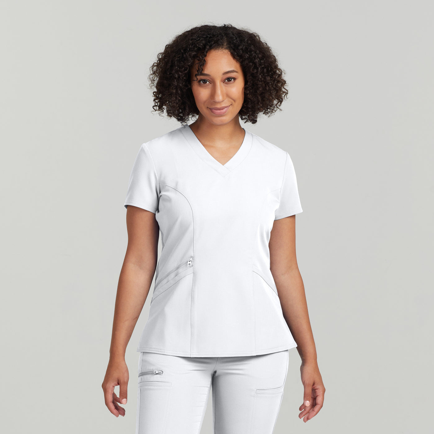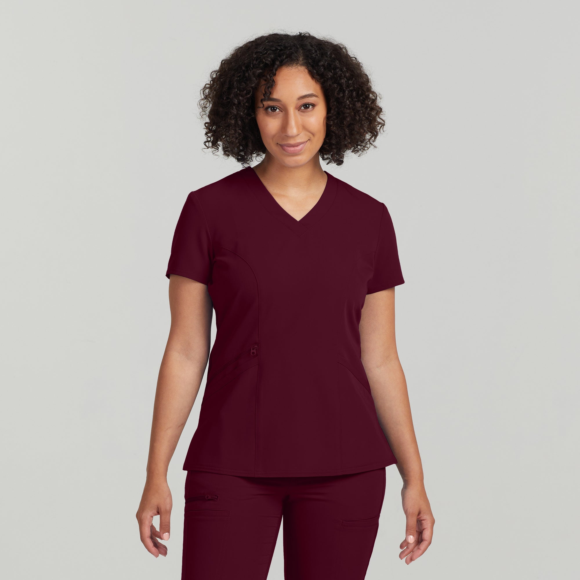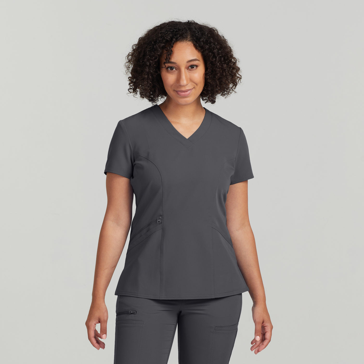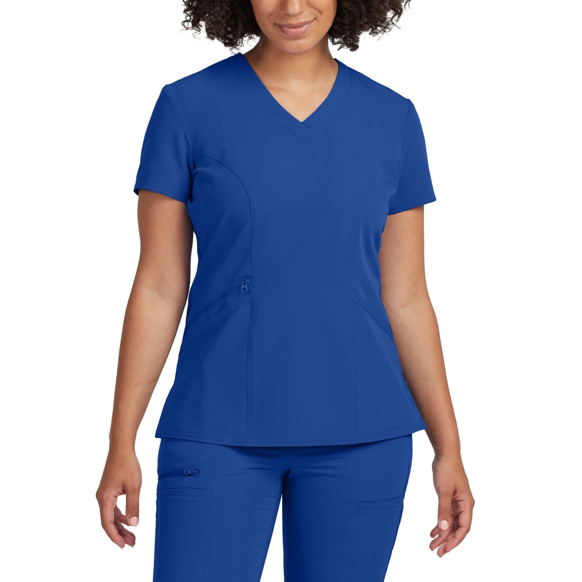 This Contemporary Fit V-neck top features 3 front pockets, 1 with a secure zipper closure. Front and back princess seams and back knit panels give this style a flattering shape and comfortable fit.