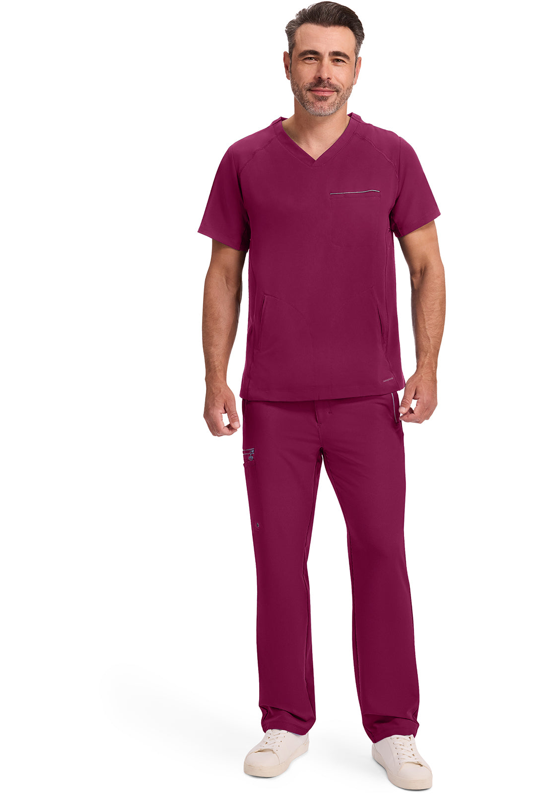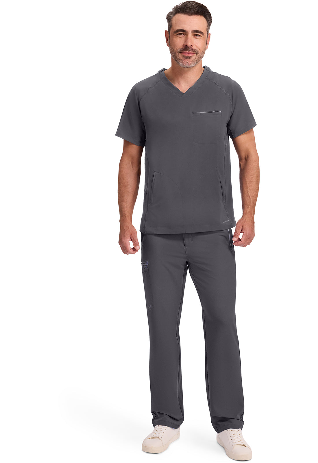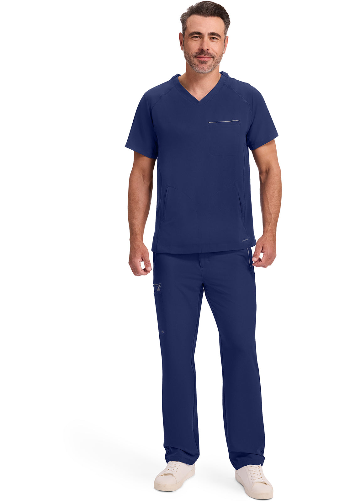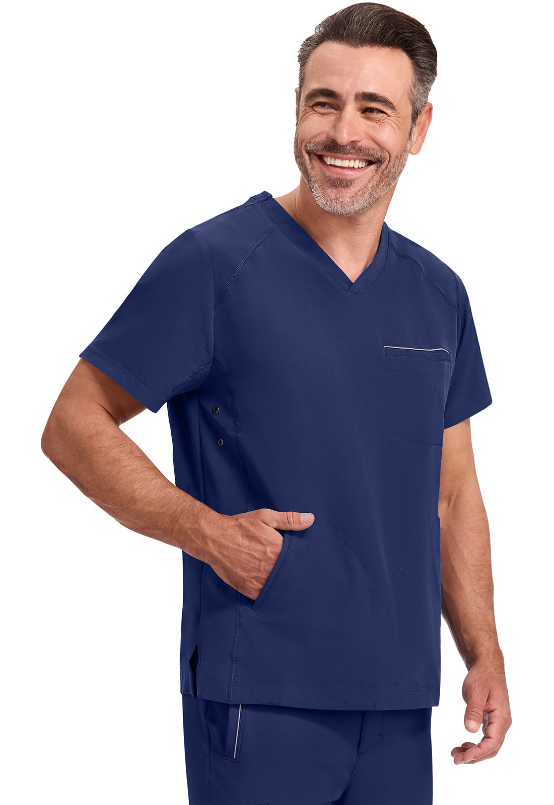 3 pocket V-neck top features 1 chest welt pocket & 2 front welt pockets. It has athletic flatlock stitching with eyelet trim on side front panels.