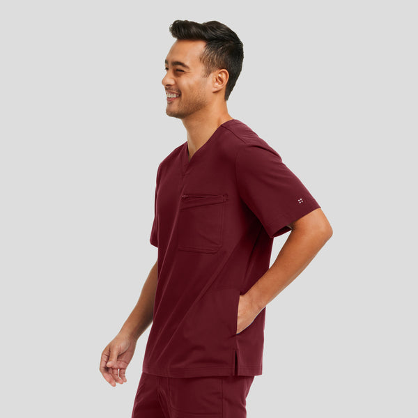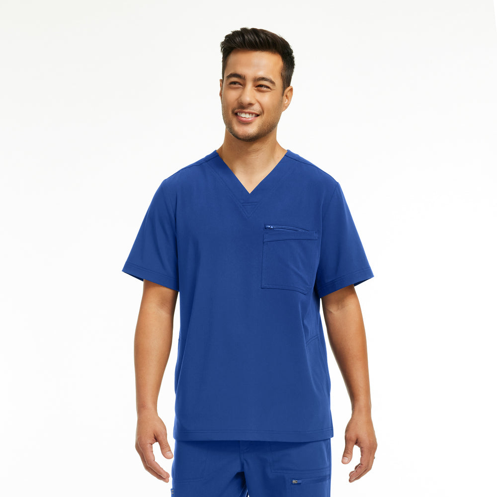 This men's V-neck tuckable top with a modern fit includes a double chest pocket featuring 1 zipper chest pocket and 1 chest patch pocket. Two additional side hip pockets keep items secured and available. Side hem slits provide extra mobility and comfort.