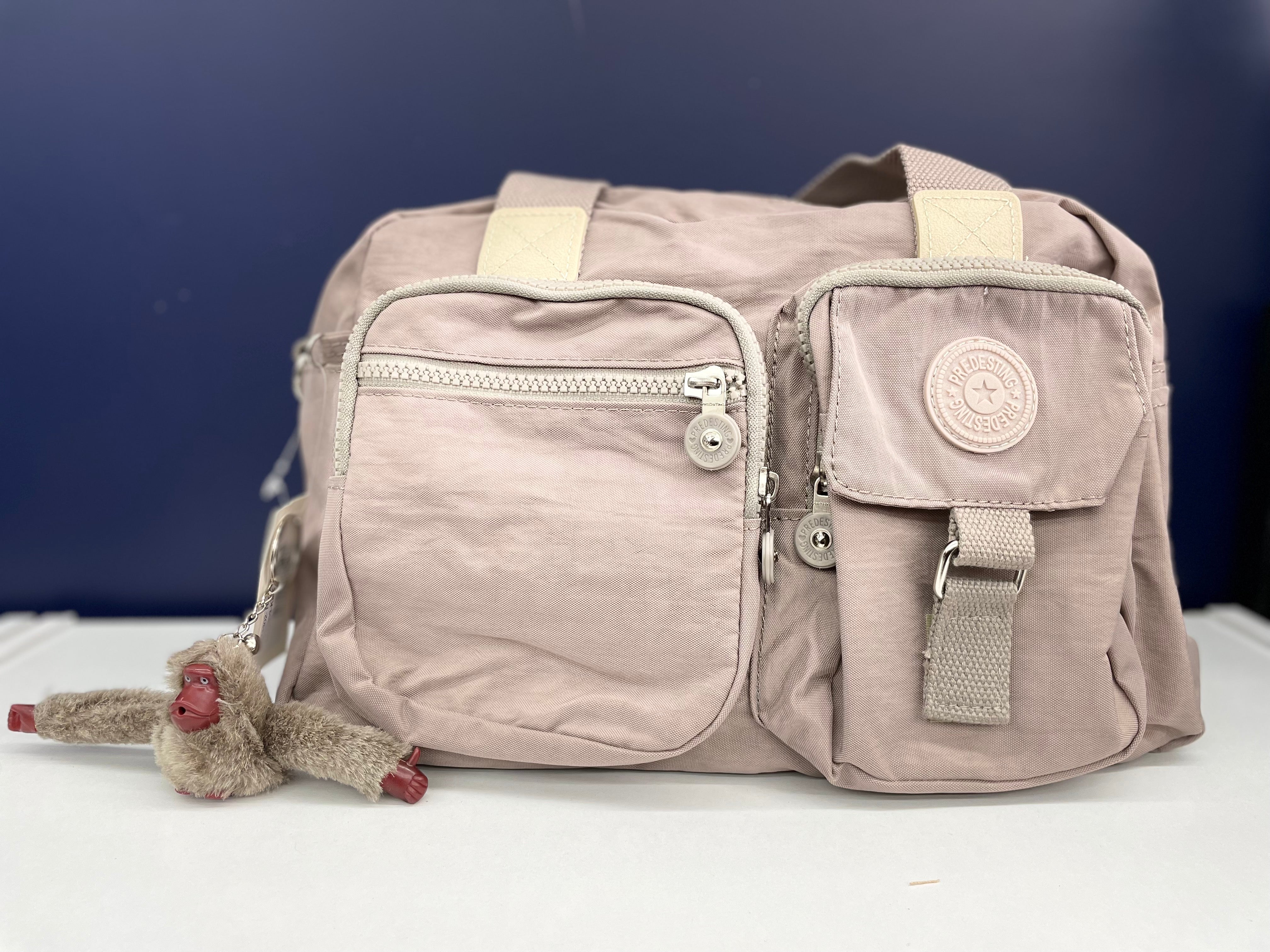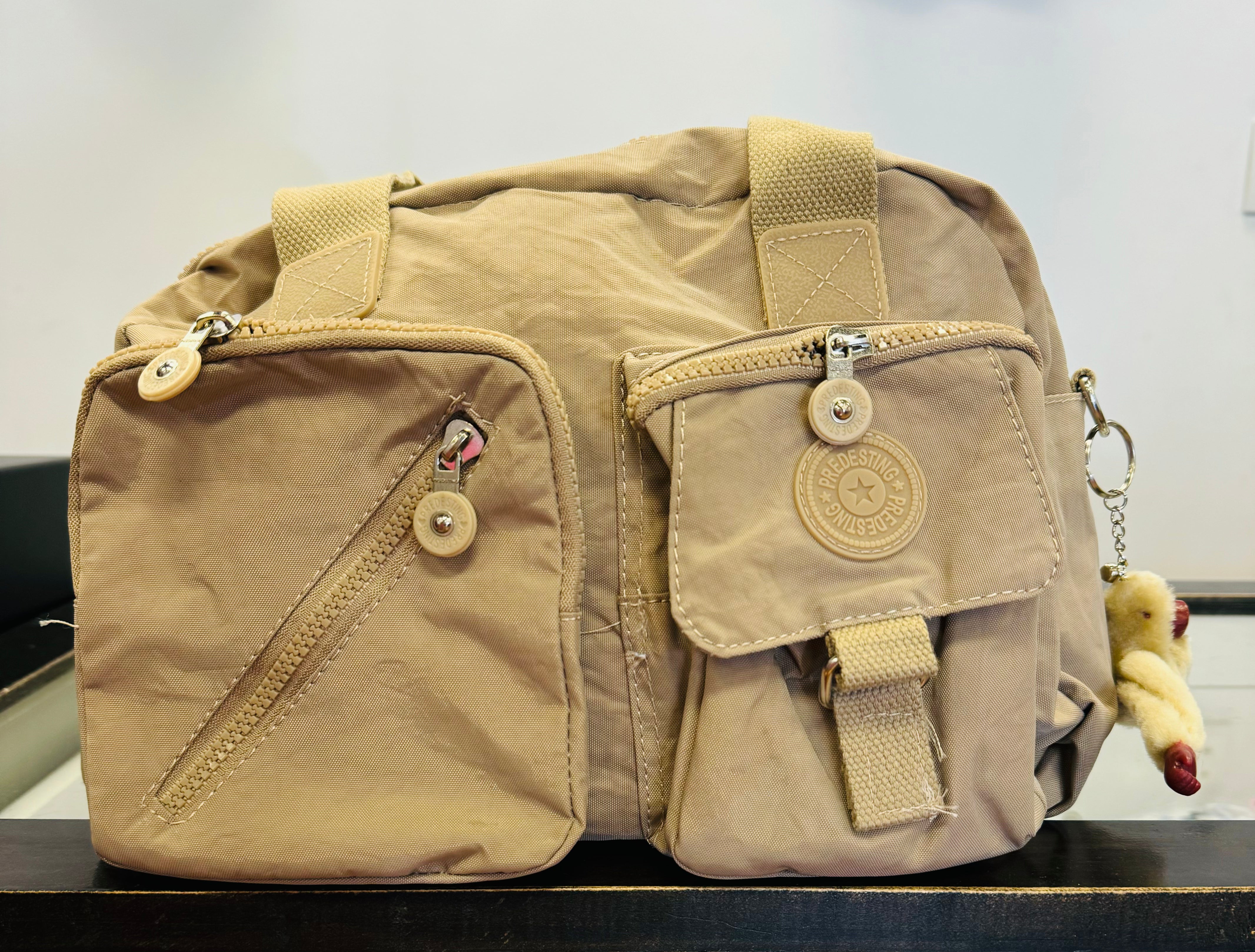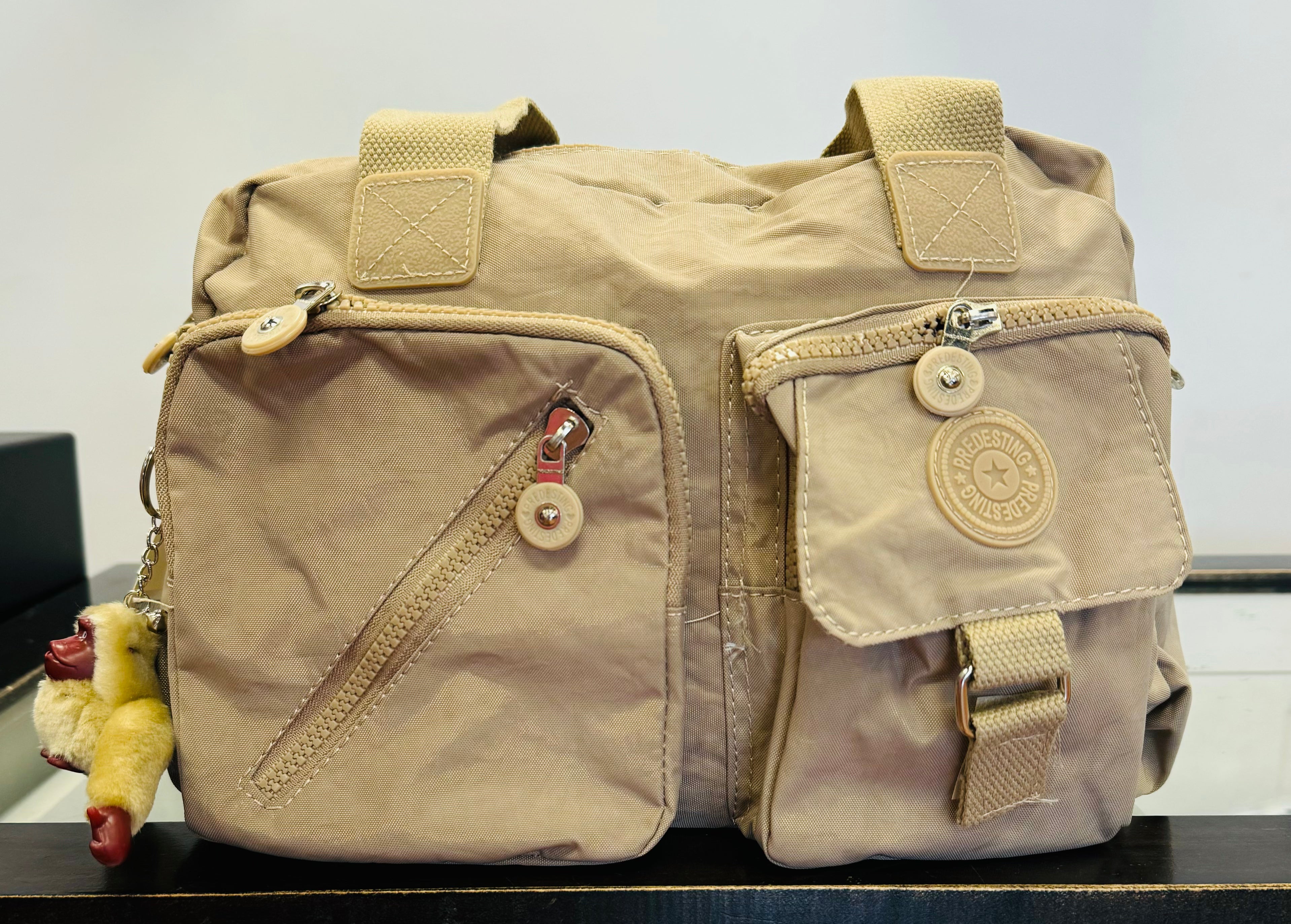 Hand bag with zipper and monkey keychain, comes in different colors and 7 or more different openings to fit all your essential belongings. Light weighted and easy to carry to work or for every day errands. It also comes with an extra sling strap, which is easy attachable and can be carried in different ways.