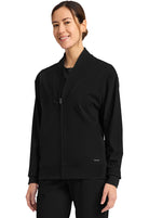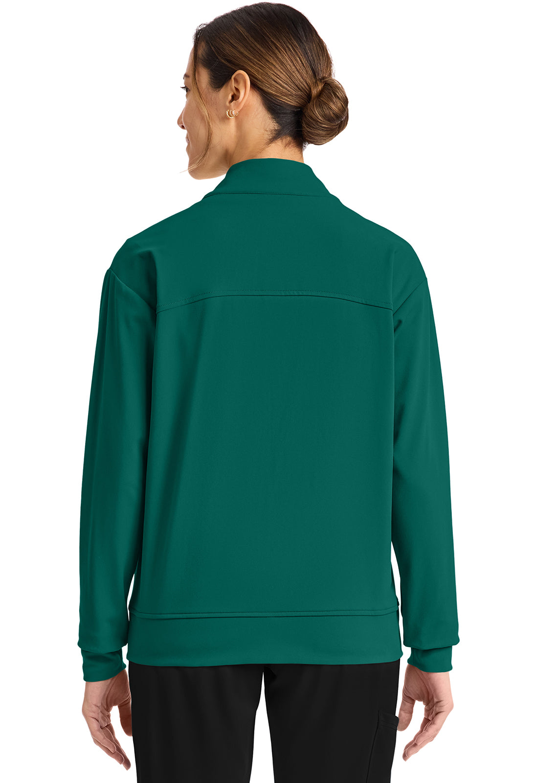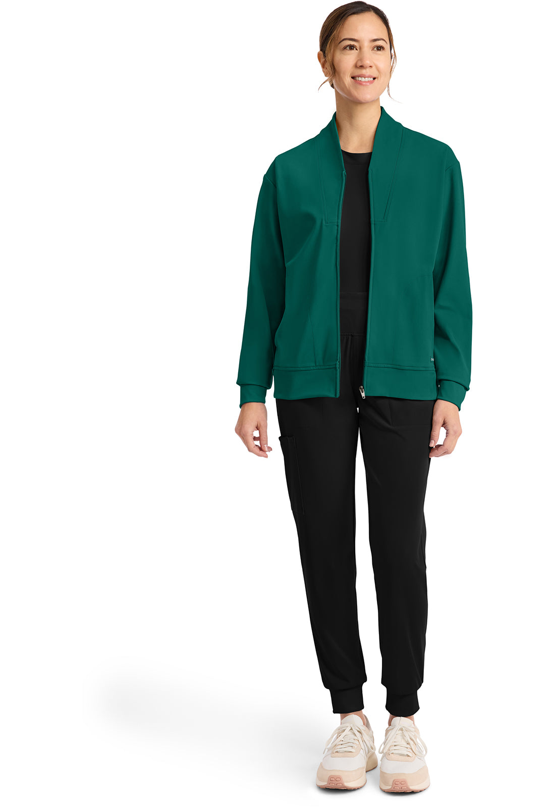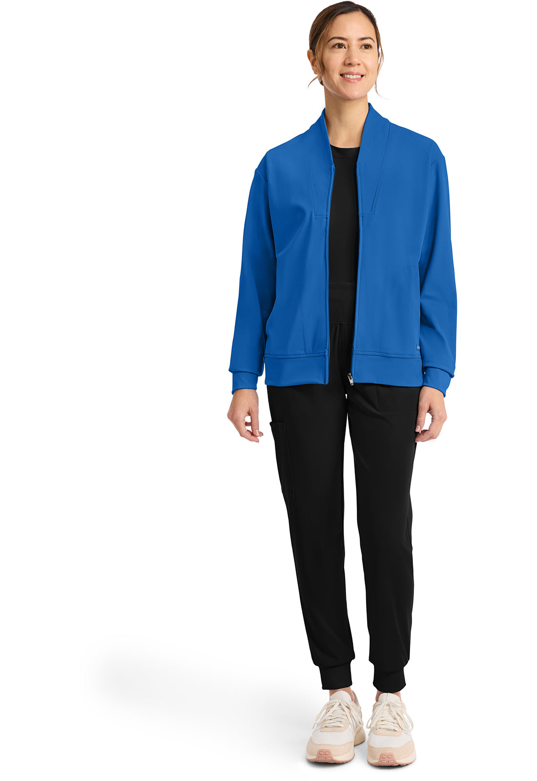 Pop the collar on a just-in jacket that nails the tracksuit trend. New comfort-tech fabric slips on seamlessly over scrubs and tees, for a casual look and polished feel. Contrast detail gives this sporty essential a stylish boost.