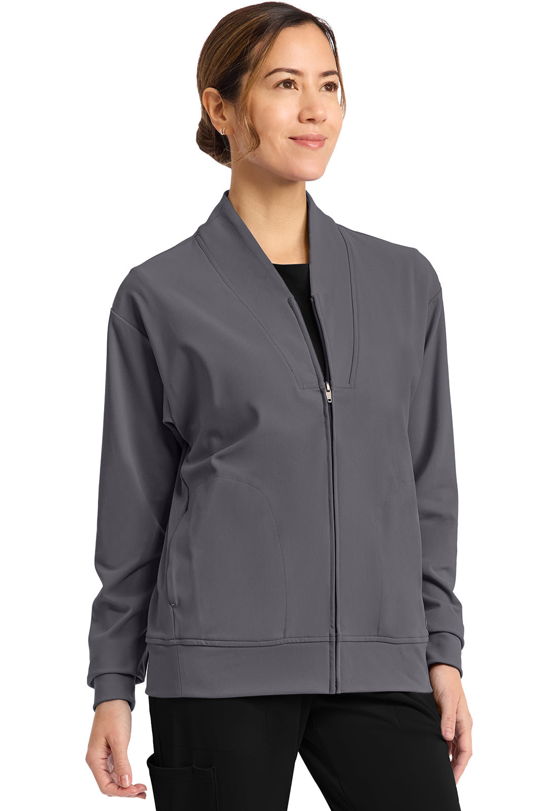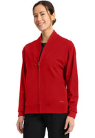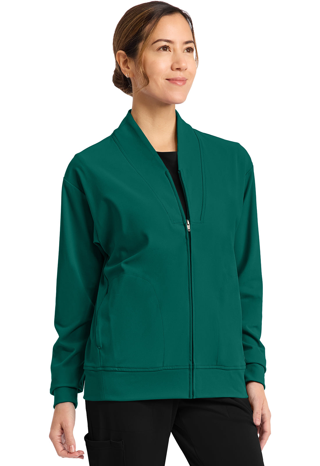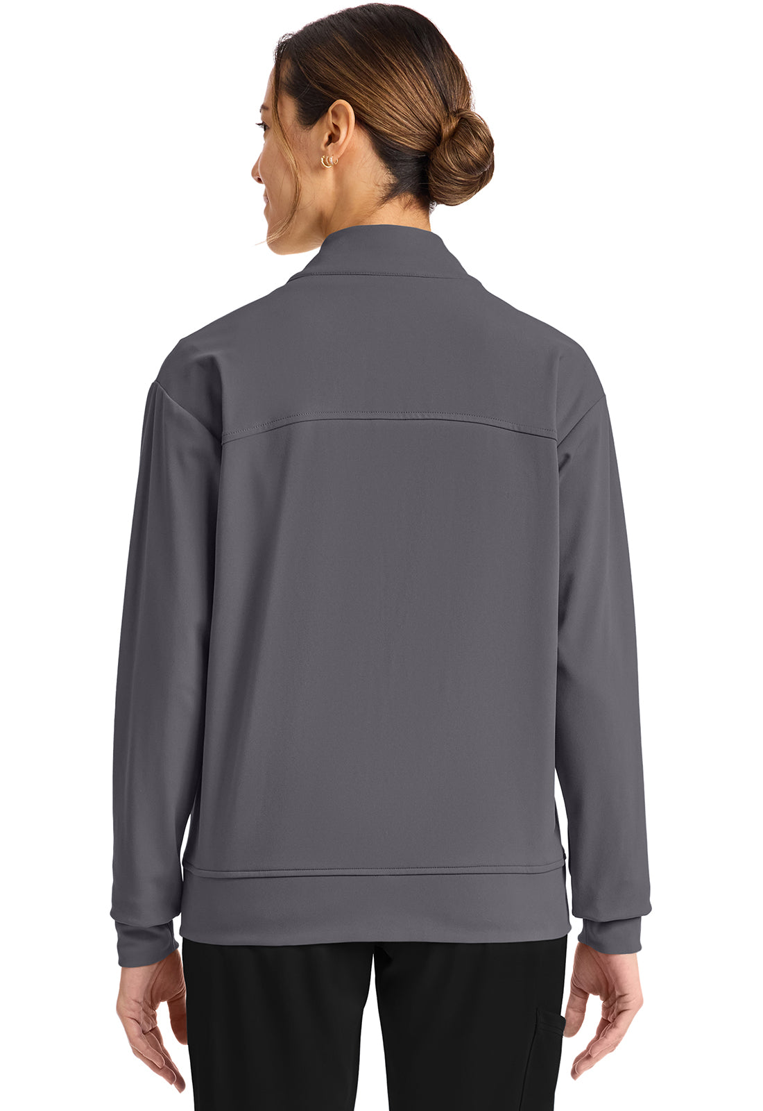Pop the collar on a just-in jacket that nails the tracksuit trend. New comfort-tech fabric slips on seamlessly over scrubs and tees, for a casual look and polished feel. Contrast detail gives this sporty essential a stylish boost.