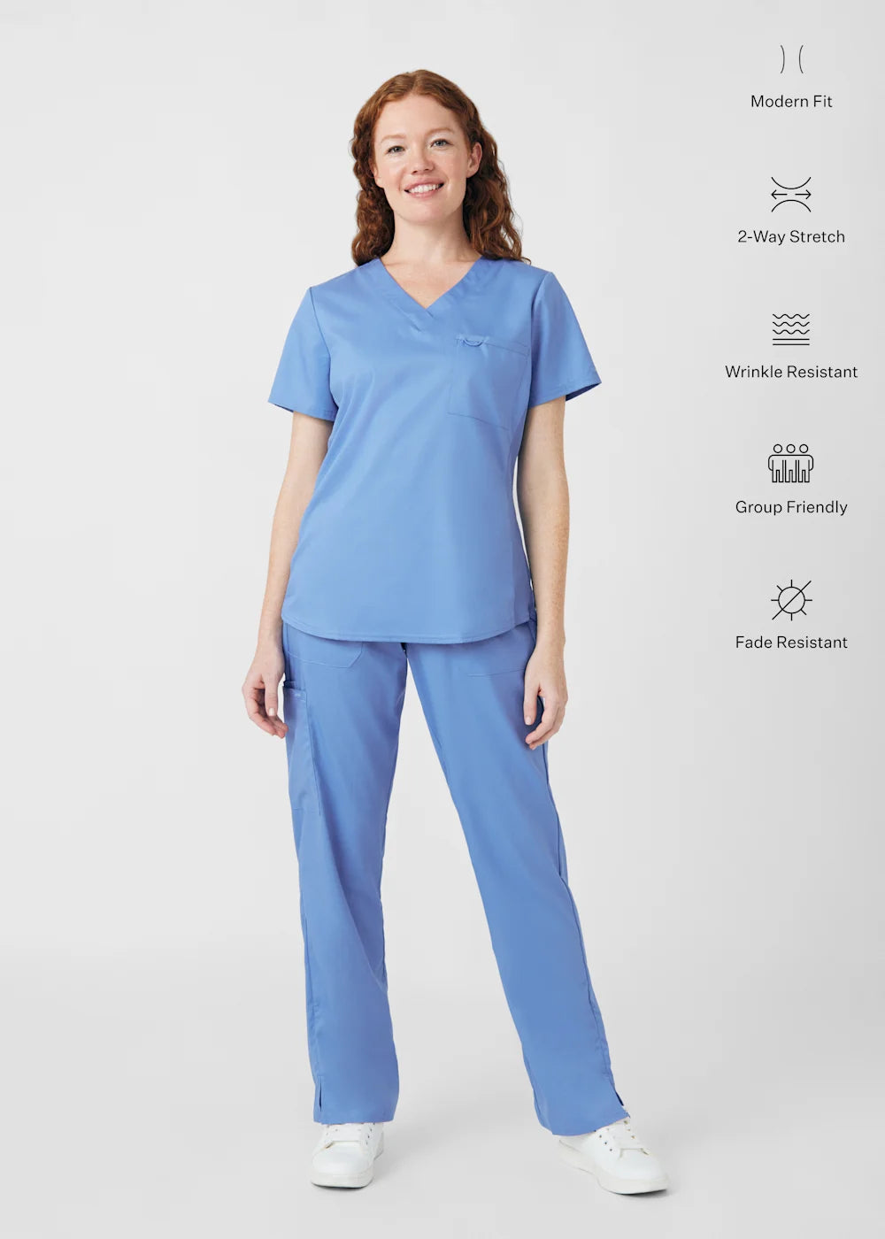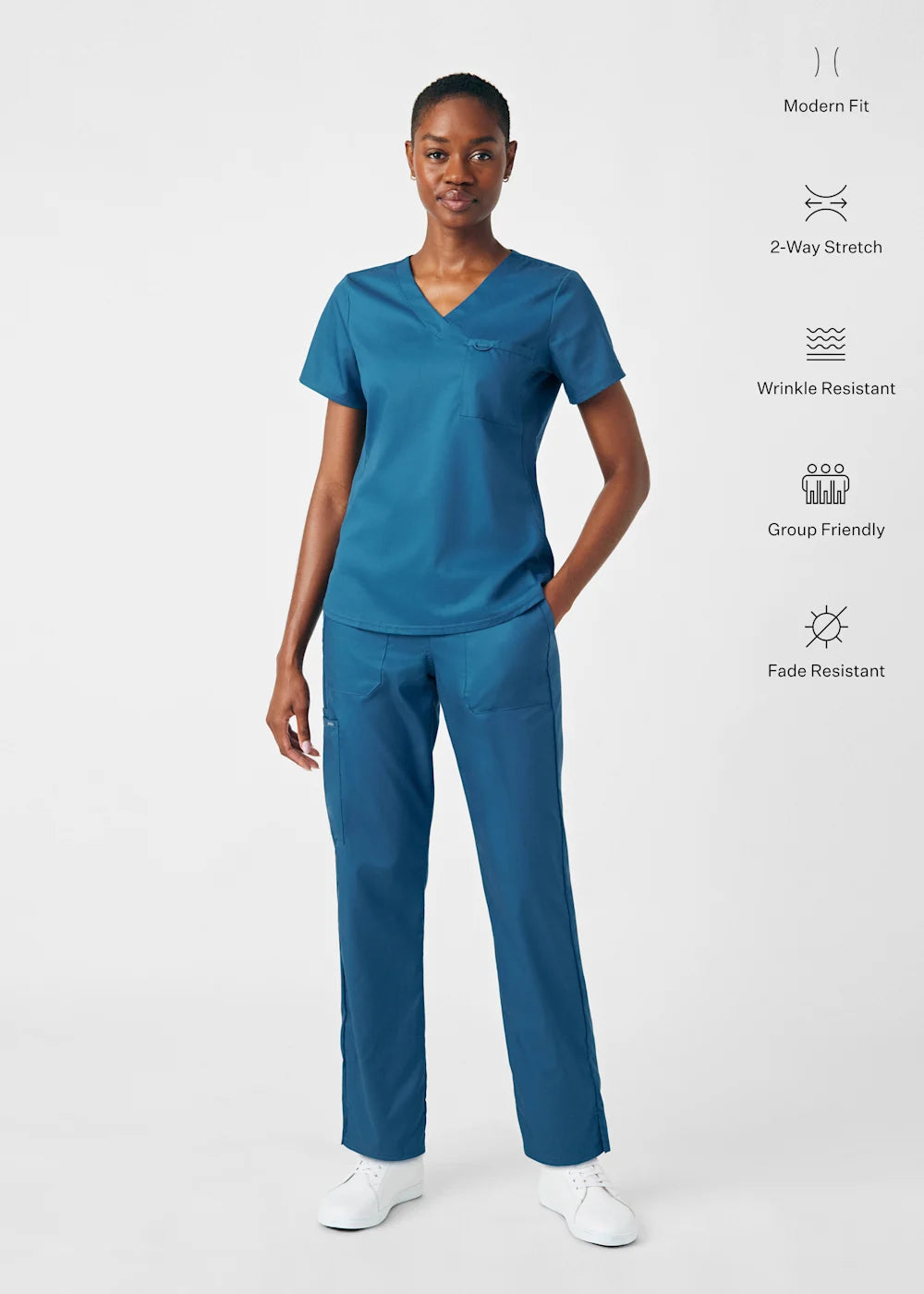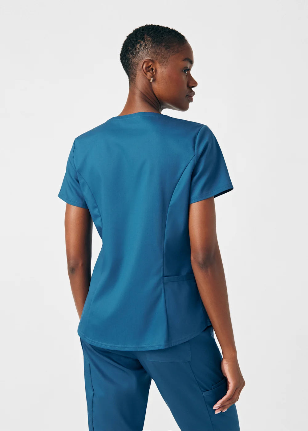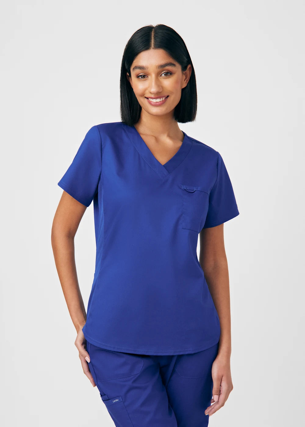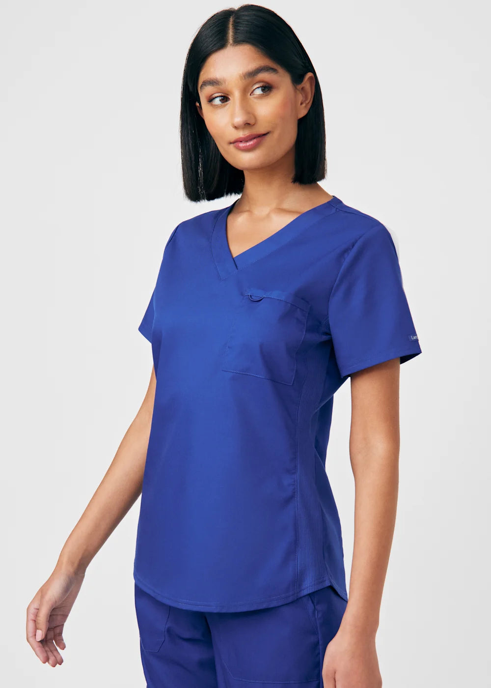 A Modern Fit, V-neck top with princess seams, and features rib knit side panels to provide comfort as you move through out your day. With a front chest pocket and a additional back side pocket to hold additional items, it can be worn untucked, half tucked, or fully tucked.