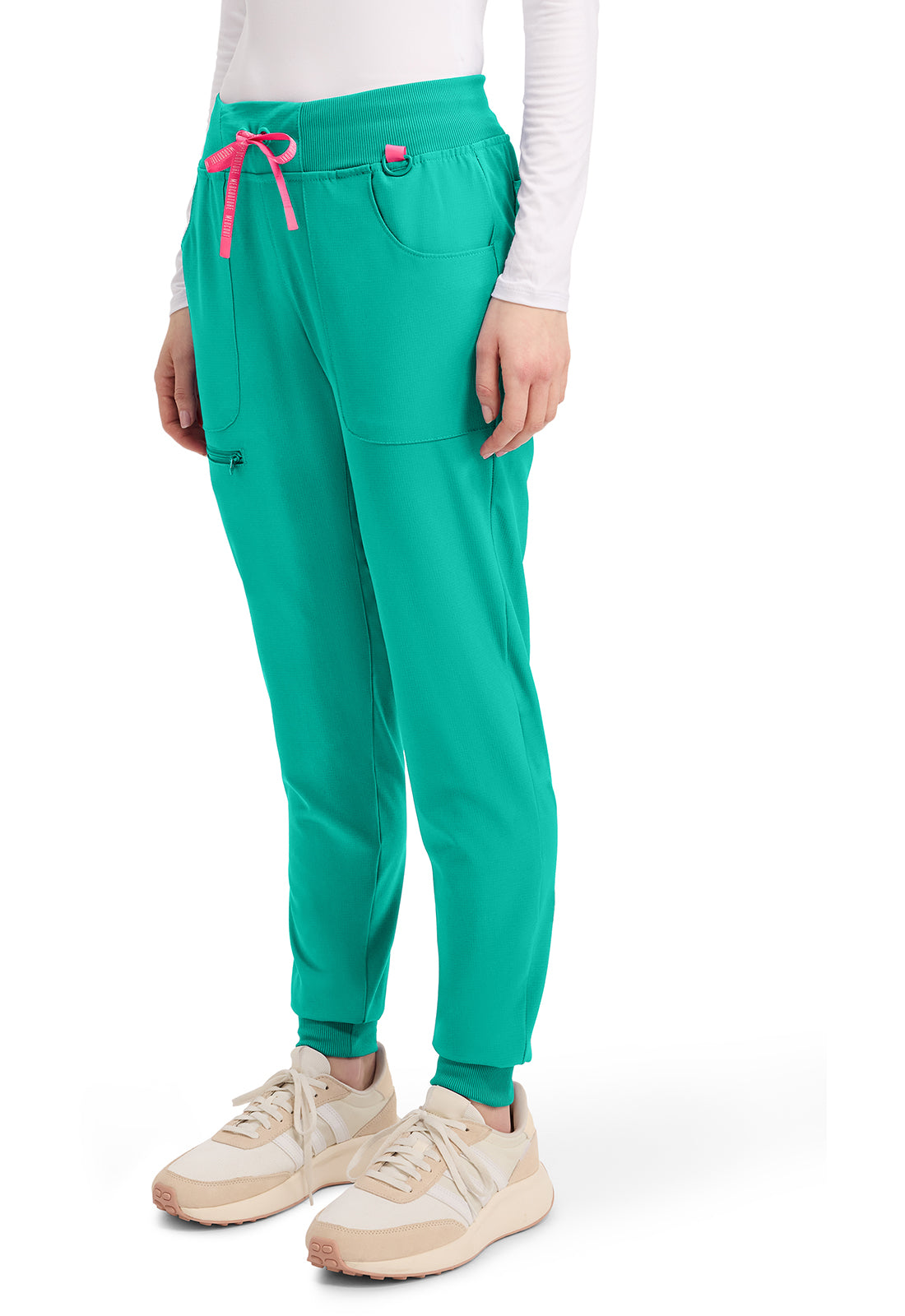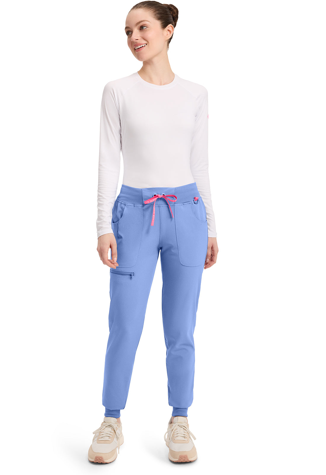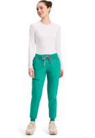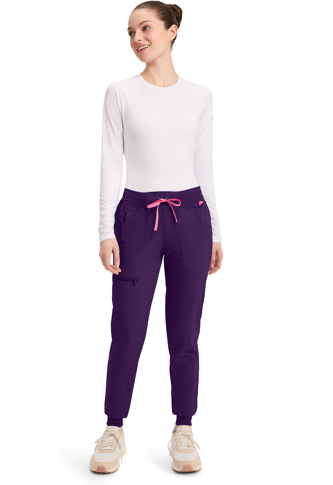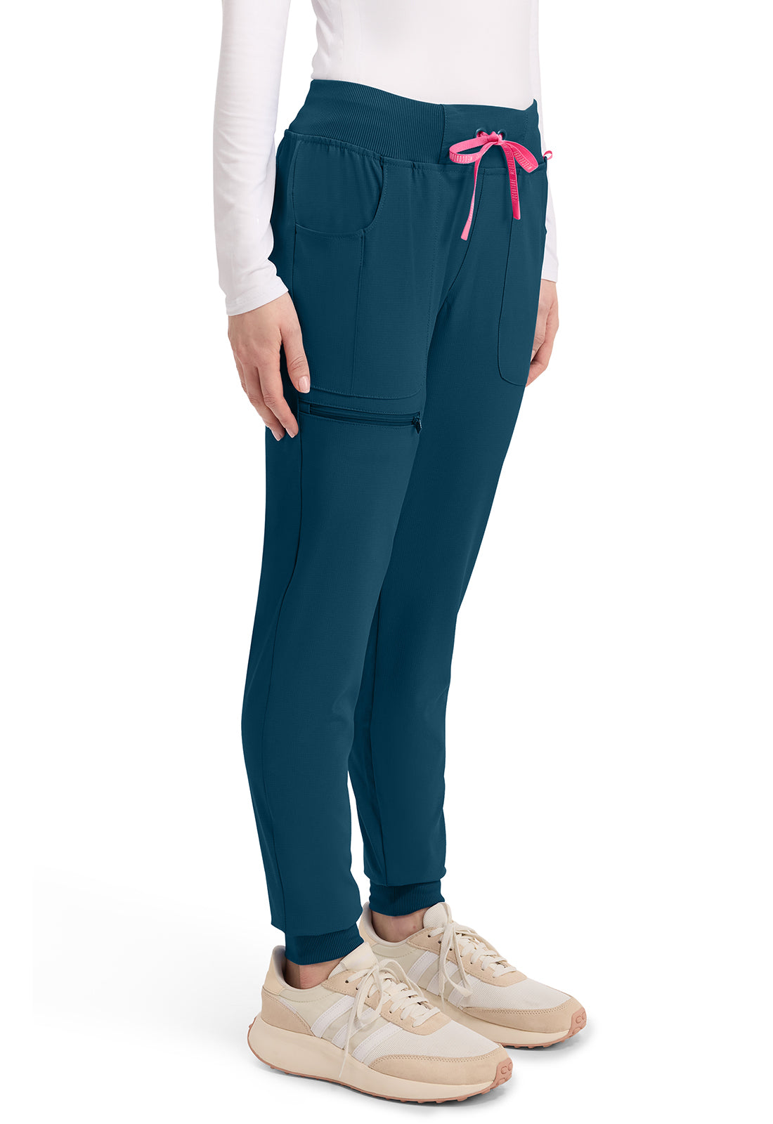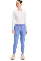 This Missy fit mid rise jogger features a rib-knit covered elastic reinforced waistband with signature color logo drawstring. There is a d-ring at the waistband and a locker loop at the center back waist. There are five pockets for organized storage: two front pockets (right with pen/instrument slot), one zipper cargo pocket, and two back patch pockets. Dyed-to-match rib-knit cuffs complete this jogger pant. Tapered jogger leg, 8 5/8" leg opening. Inseam: 29"