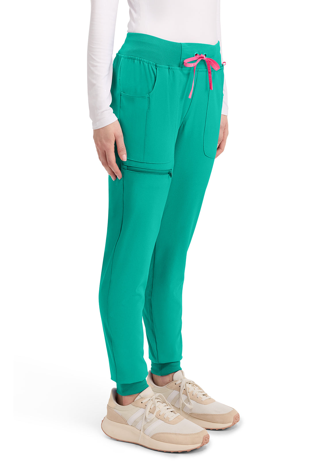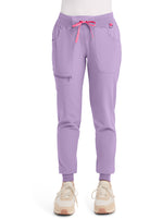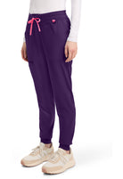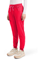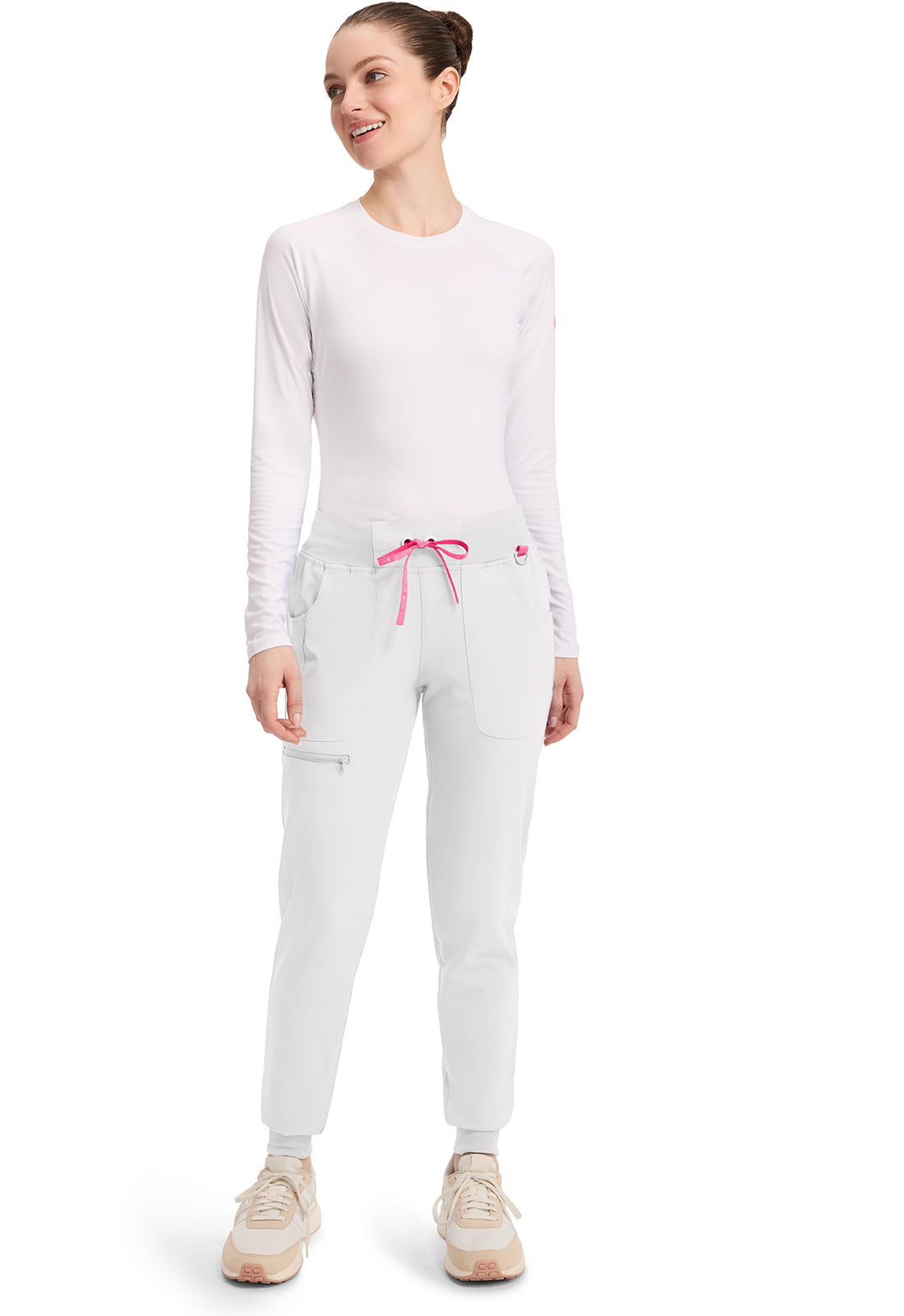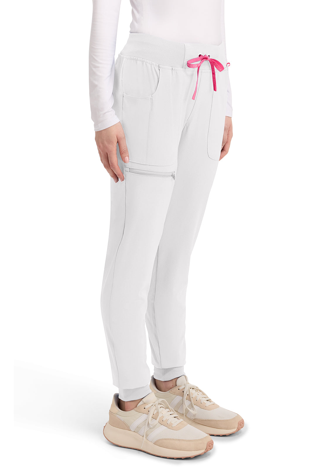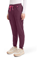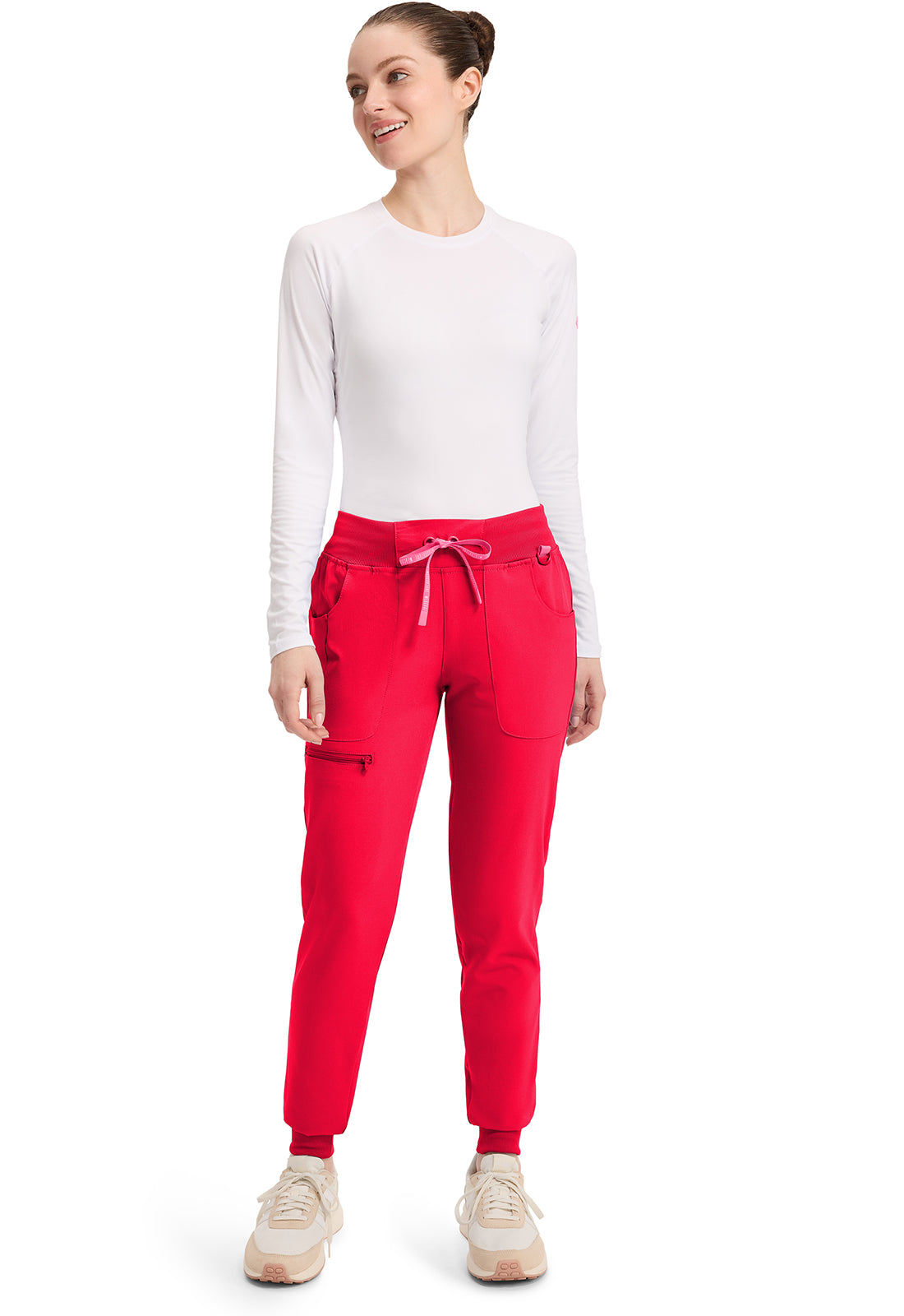 This Missy fit mid rise jogger features a rib-knit covered elastic reinforced waistband with signature color logo drawstring. There is a d-ring at the waistband and a locker loop at the center back waist. There are five pockets for organized storage: two front pockets (right with pen/instrument slot), one zipper cargo pocket, and two back patch pockets. Dyed-to-match rib-knit cuffs complete this jogger pant. Tapered jogger leg, 8 5/8" leg opening. Inseam: 29"