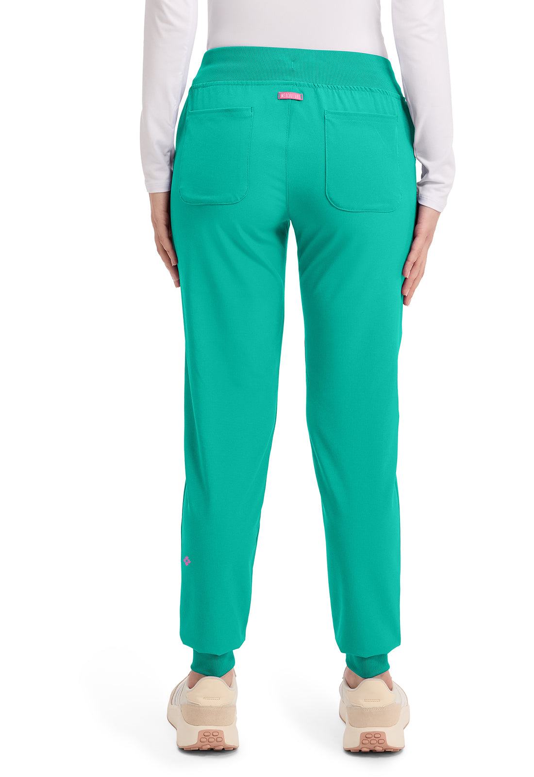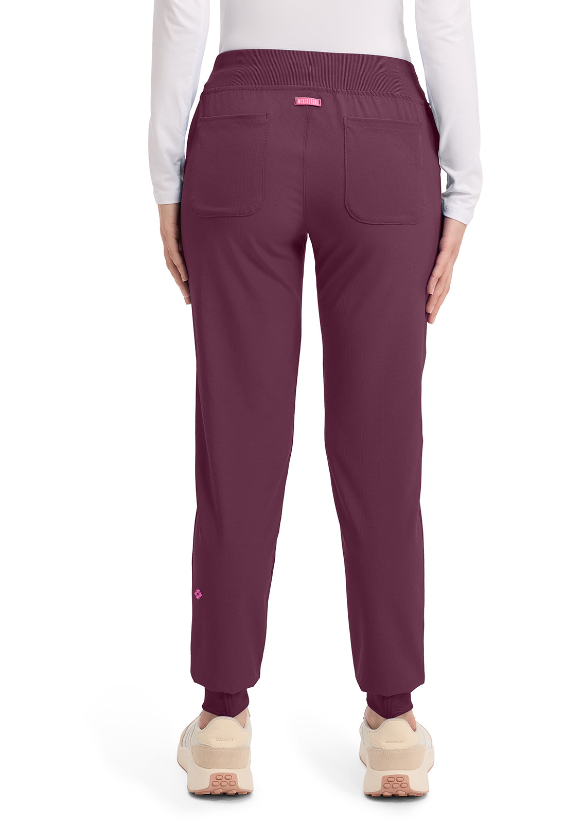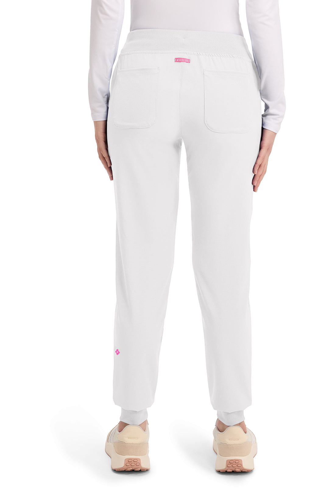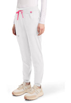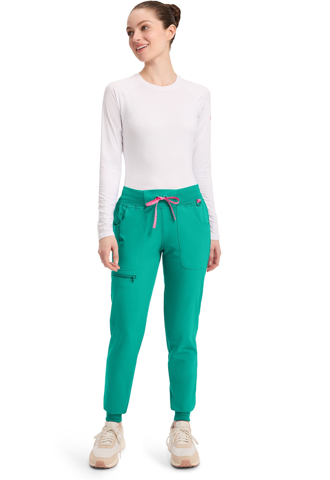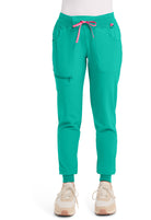 This Missy fit mid rise jogger features a rib-knit covered elastic reinforced waistband with signature color logo drawstring. There is a d-ring at the waistband and a locker loop at the center back waist. There are five pockets for organized storage: two front pockets (right with pen/instrument slot), one zipper cargo pocket, and two back patch pockets. Dyed-to-match rib-knit cuffs complete this jogger pant. Tapered jogger leg, 8 5/8" leg opening. Inseam: 29"