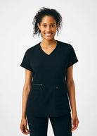 A Modern Fit v-neck top with a piecing detail neckline gives this top an elevated look. Features a single zipper pocket to keep your personal items secure and 2 welt pockets for easy access to grab anything you may need. Back side knit panels provide extra comfort and movement.
