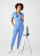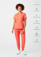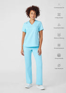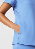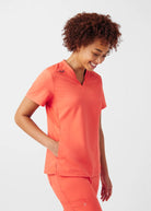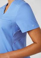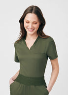 This V-neck top for women embodies a contemporary and adaptable style, featuring a knit collar and side panels that offer breathability and freedom of movement. With a chest pocket and a side pocket, this top provides a practical tuck-in option for added convenience.