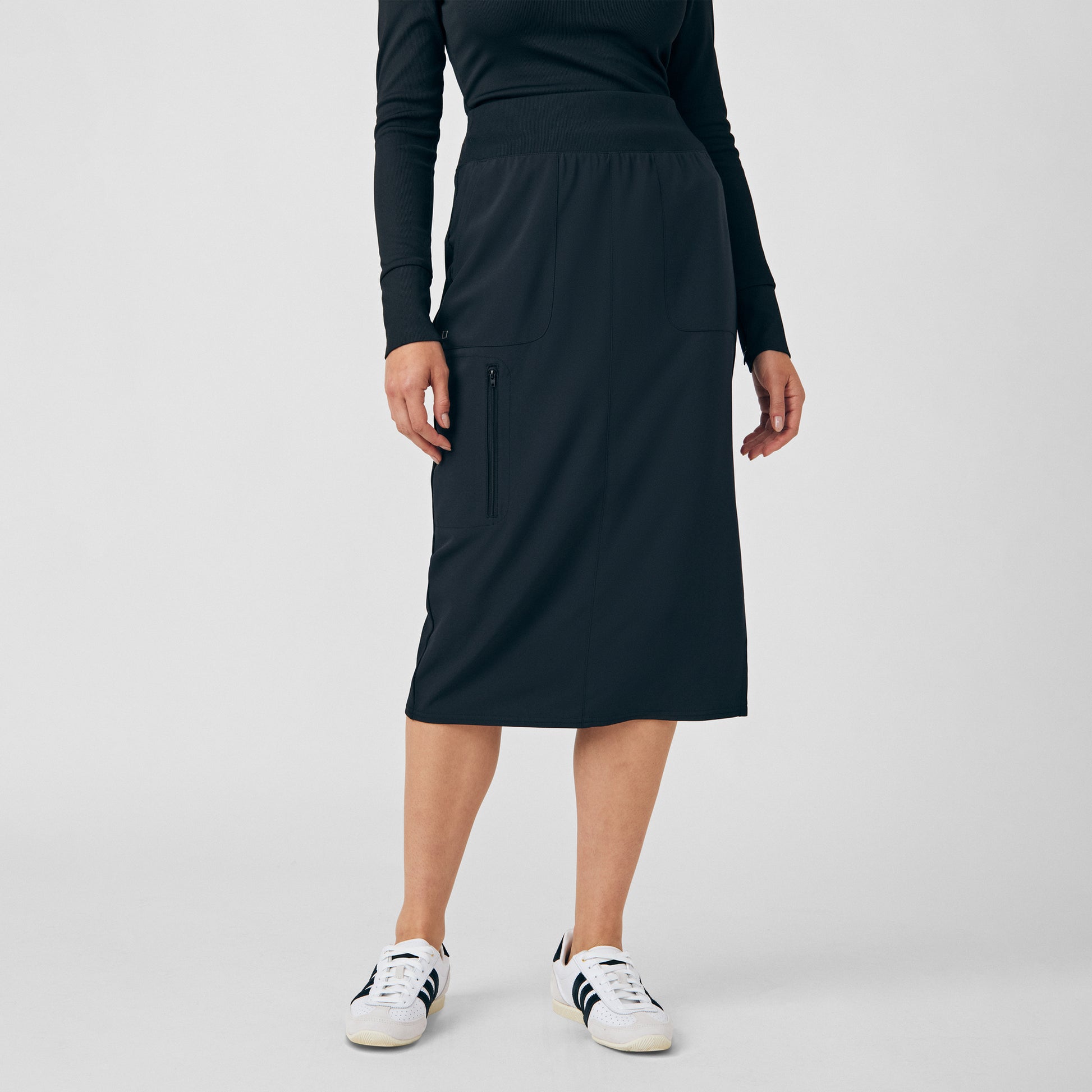 Stay active and comfortable on the job in this modest scrub skirt. It includes three functional pockets, including a secure zipper cargo pocket for storing essentials. The wide rib-knit waistband with elastic and an internal drawcord ensures a snug, adjustable fit, while a side vent enhances mobility for easy movement throughout your day.
